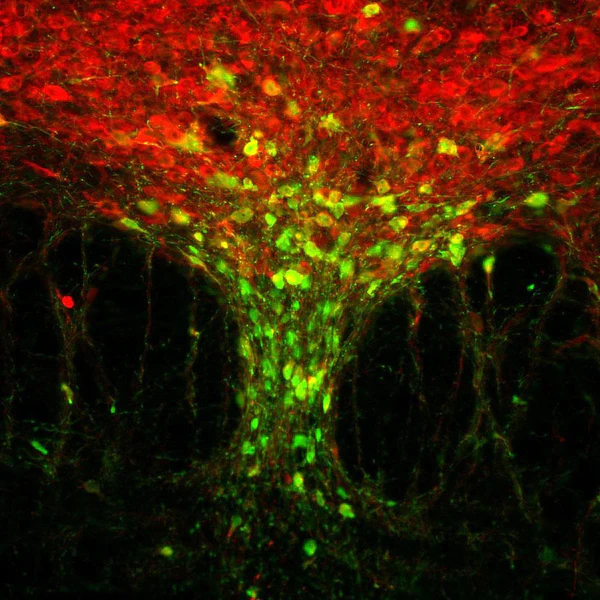 Staining of a tissue section through the midbrain region of an adult mouse for GFP (green) and Tryptophan Hydroxylase-positive neurons (RED).